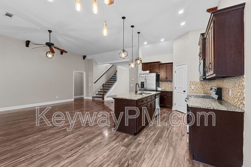 Welcome to Chastain Place, a beautifully maintained home offering 5 bedrooms, 3 bathrooms, and 2,686 sq ft of bright, stylish living space in the heart of Grovetown. This spacious two-story layout features an open floor plan perfect for modern living, complete with granite countertops, stainless steel appliances, and a flowing main level designed for comfort and entertaining. Enjoy a downstairs guest bedroom (the only carpeted space), while the expansive primary suite and three additional bedrooms sit privately upstairs. Outside, relax under the covered patio overlooking a large fenced backyard, ideal for gatherings, pets, or quiet evenings at home. Neighborhood pool access adds even more to love!